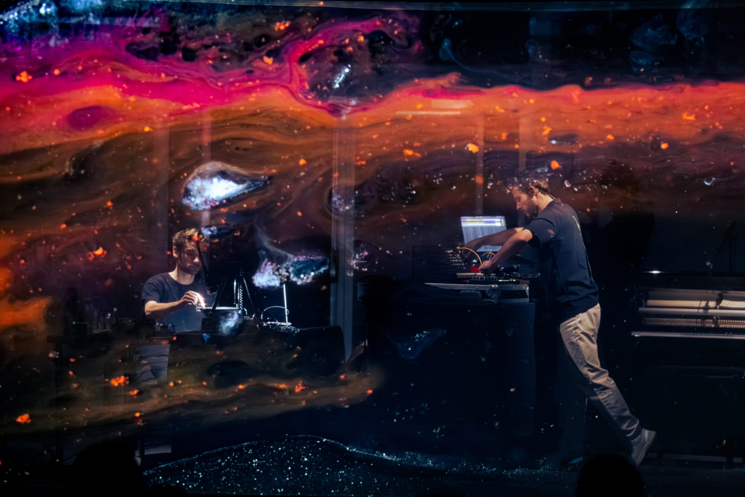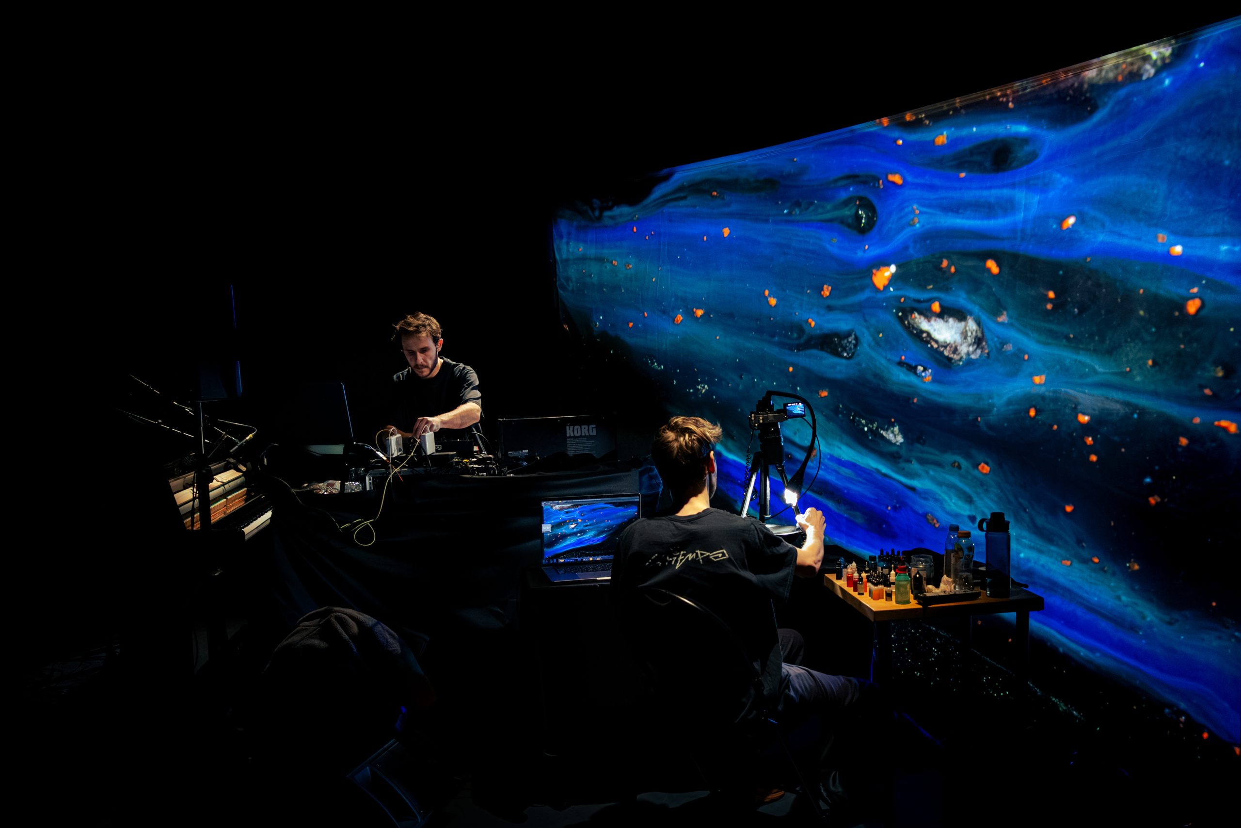 Alliance Cosmique est un spectacle audiovisuel créé par les artistes Symbiose et Iuni. Iuni dévoile son univers néoclassique et cosmique, tandis que Symbiose crée des visuels en direct à l’aide de liquides et de réactions chimiques, capturés en temps réel et projetés à grande échelle. Découvrez un voyage au cœur du cosmos.