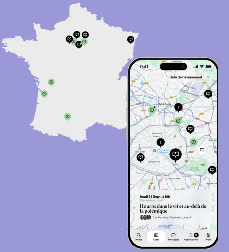 Lancée au festival du livre en avril 2025, l’appli qui en résultera n’est ni tout à fait un réseau social, ni une appli de rencontres focalisée sur le dating — bien que l’équipe reconnaisse que des célibataires ne soient pas à l’abri bonnes surprises ! Au lieu de cela, l’application s’inscrit dans ce que l’on appelle la troisième vague de l’internet social: celles de rencontres en présentiel (en anglais, in-real-life, ou IRL).